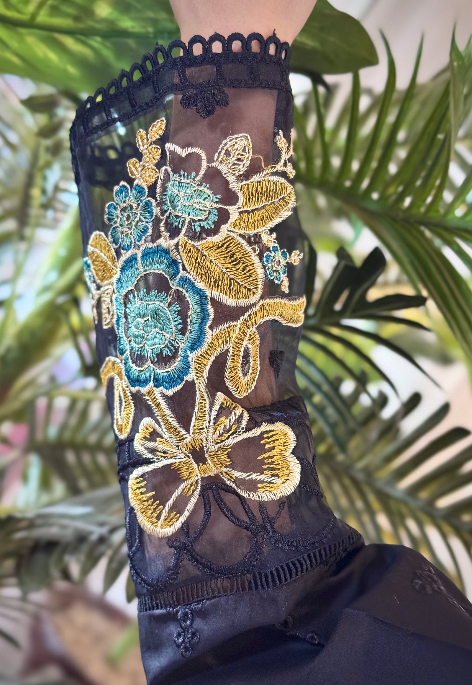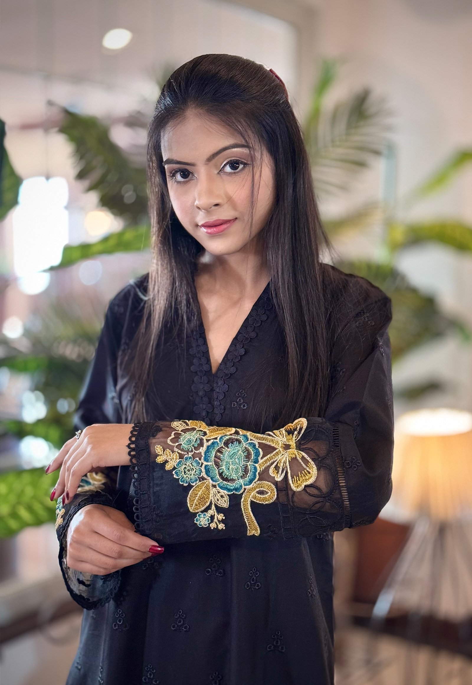 Sleeves:ย Full-length with stylish embroidery on cuffs