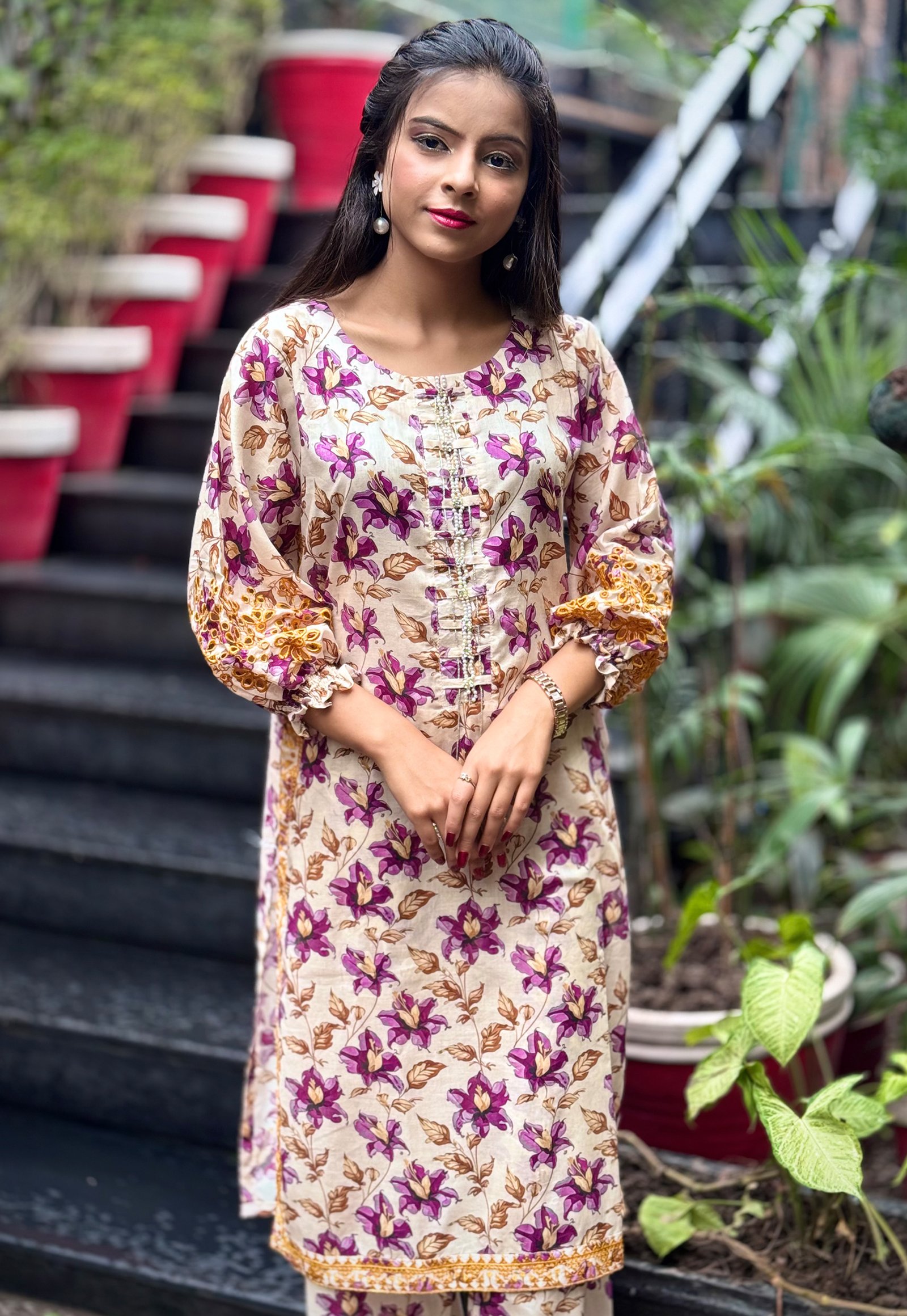 - Trousers:ย Straight-cut, complementing the kurta design