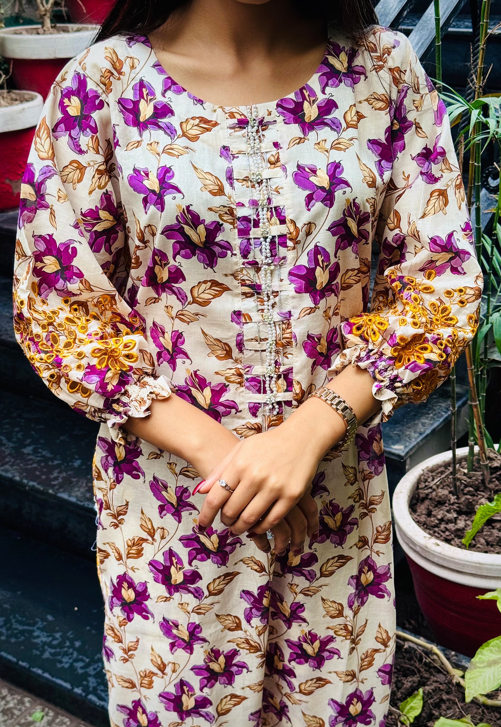 Sleeves:ย Full-length with stylish embroidery on cuffs